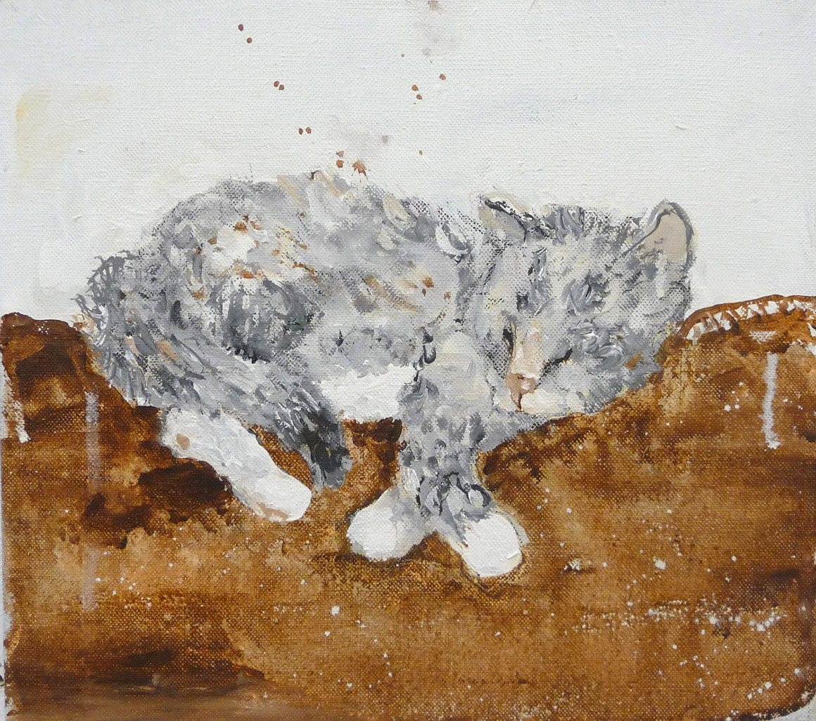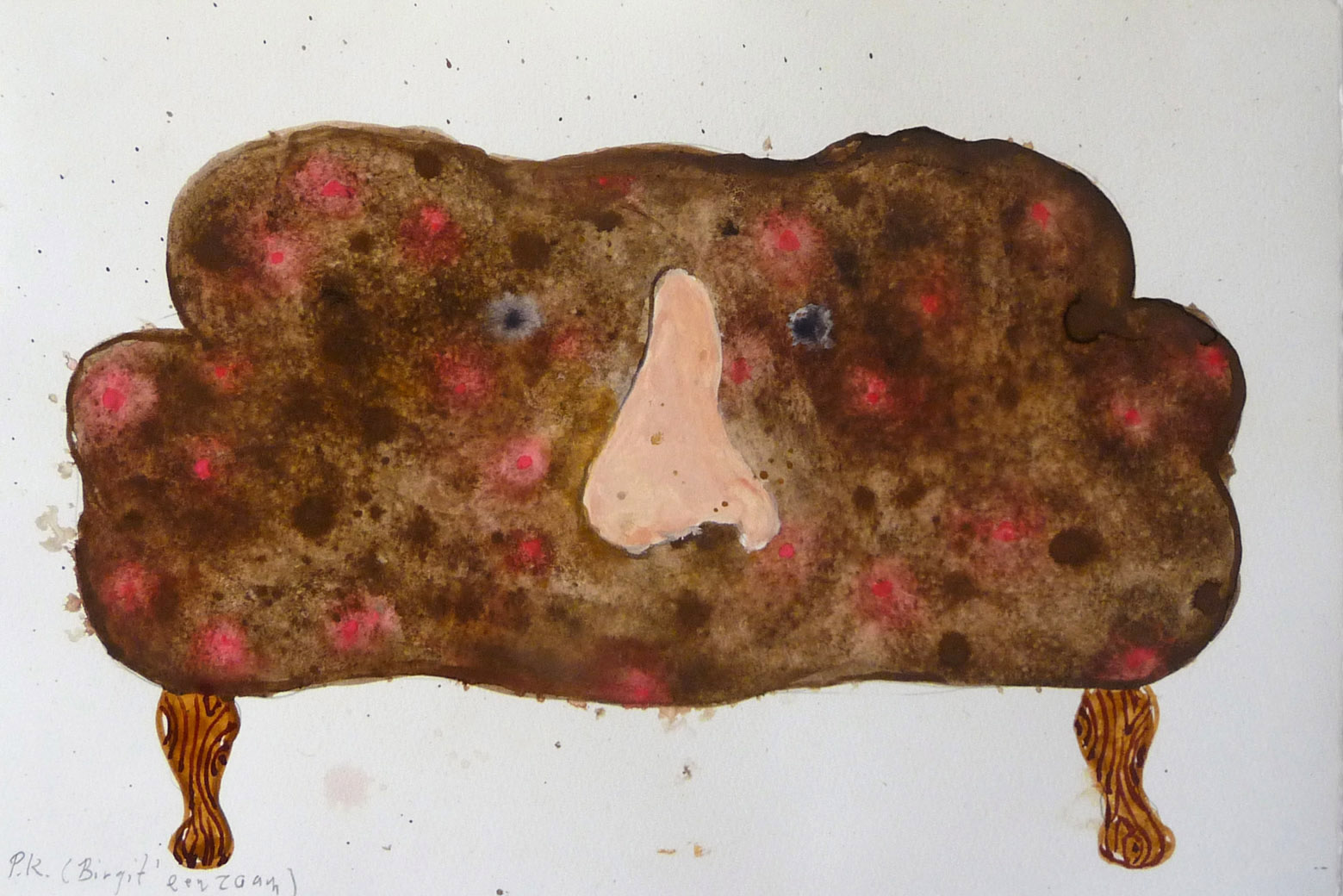 Birgit beschreef me wat het beeld van eenzaamheid voor haar was: Zij op de bank met haar vier oude katten op de bank naar buiten door het raam starend. Van dit beeld heb ik een eenvoudige kleine aquarel gemaakt en tevens schilder ik zo af en toe haar portret vanuit mijn geheugen.(soms heb ik haar te pakken volgens haar)